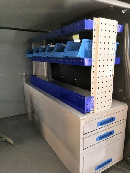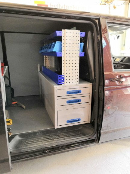 ”Tällainen kalustus sopii loistavasti maanrakennusalan yrittäjälle. Pitkien ulos aukeavien vetolaatikoiden johdosta ei tarvitse nousta autoon joka kerta, kun hakee tavaraa.”