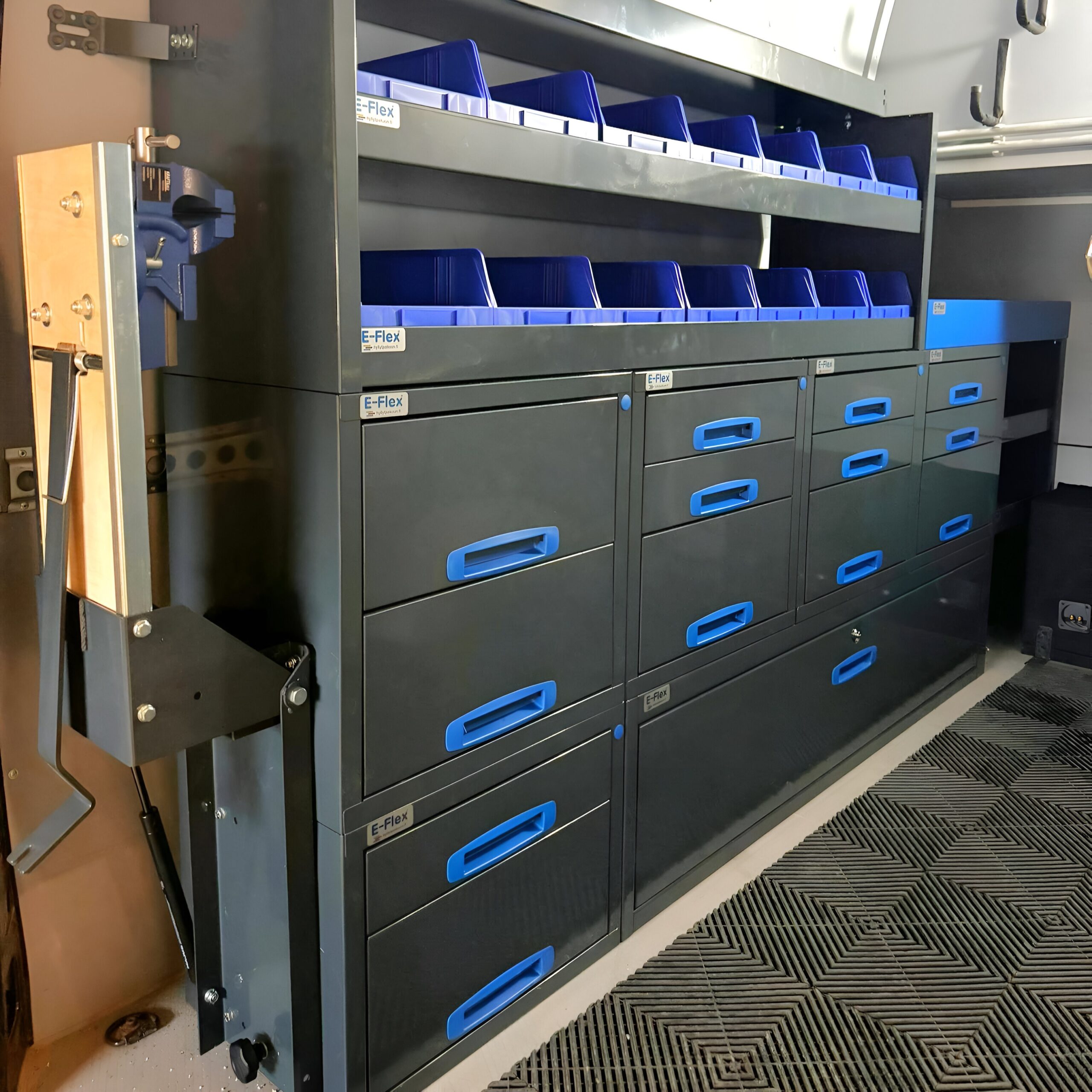 Mercedes-Benz extrapitkä A4 retkeilyauto tavaratilan hyllykkö työkalujen säilytystä varten. Asiakkaalle toimitettiin kalusteet ja asiakas asensi kalusteet itse paikalleen. Autoon asennettiin retkeilyauton tavaratilaan erikseen suunniteltu hyllyvarustelu, jossa paljon vetolaatikoita, avohyllytasoja ja ottolaatikoita työkalujen ja tarvikkeiden säilytystä varten. Kalusteen takapäädyssä on taittuva ruuvipenkki, joka taittuu auton takaovesta ulos. Tämä auto on extrapitkä Sprinter noin kolmen metrin tavaratilalla.