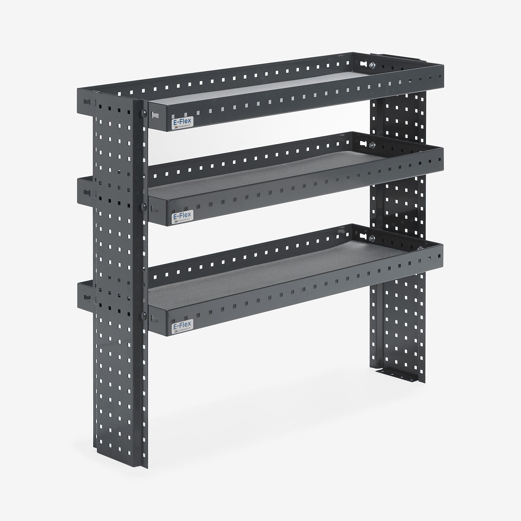 E-Flex 100 cm pakettiauton hylly kolmella korkeus-säädettävällä hyllytasolla. Avohylly pitää pakettiauton järjestyksessä tyylikkäästi ja helposti.