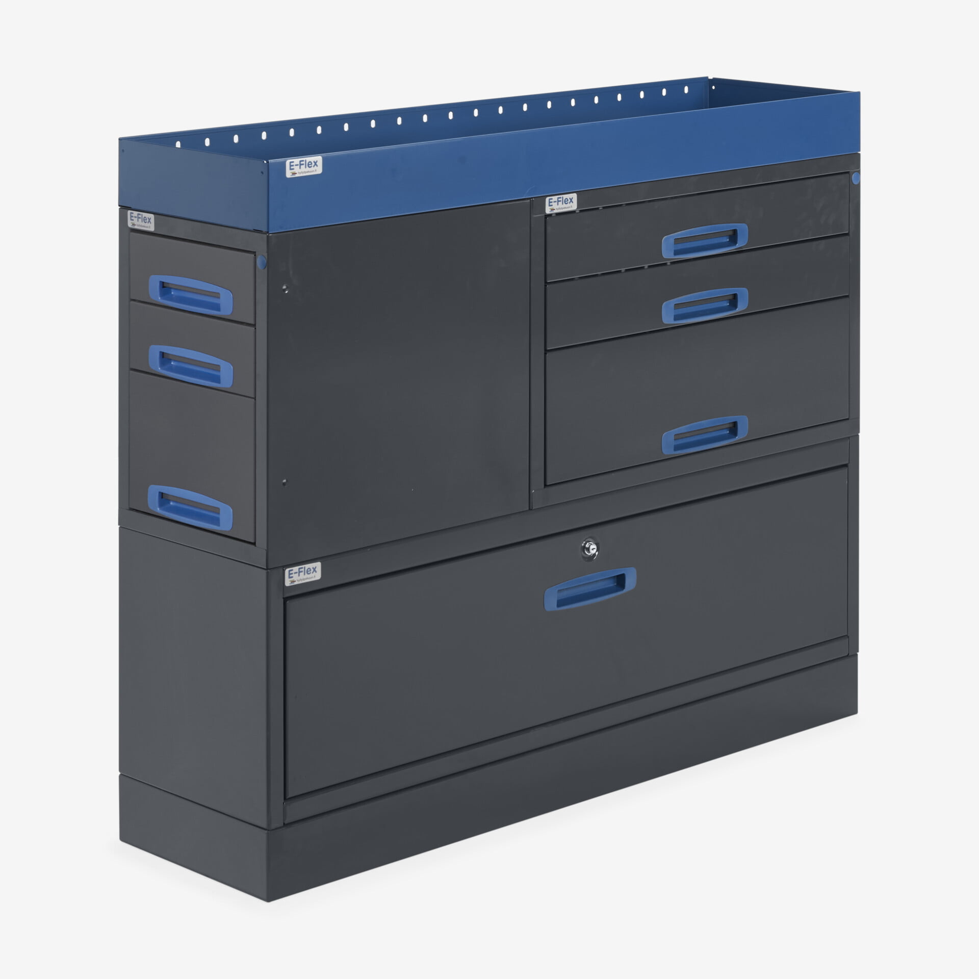 Jämerät E-Flex pakettiauton hyllyköt / laatikostot ovat suosittuja ja monipuolisia pakettiauton kalusteita. Kalusteessa on yhdistetty vetolaatikoita, avohyllyjä ja muita säilytystiloja. Hyllykkö- / laatikostojen pääväri on pulverimaalattu antrasiitti ja toisena värinä on tyylikäs pulverimaalattu sininen. Moduuleista koosttuvat tuotekokonaisuudet on helppo ja selkeä kasata sekä asentaa. Tuotekokonaisuudet ovat moduulirakenteensa vuoksi myös hyvin muunneltavissa. Vetolaatikostojen kiskot ovat kuulalaakeroituja (kantavuus 40 kg) ja tehty nimenomaan pakettiautoja varten eli laatikot lukittuvat paikalleen sekä auki että kiinni -asennoissa eivätkä aukeile itsekseen ajon aikana. Annamme tuotteille 10 vuoden takuun, joka takaa että nämä todella kestävät vaativammassakin ammattikäytössä. Täydennä kalusteesi tarvittavilla lisävarusteilla.
