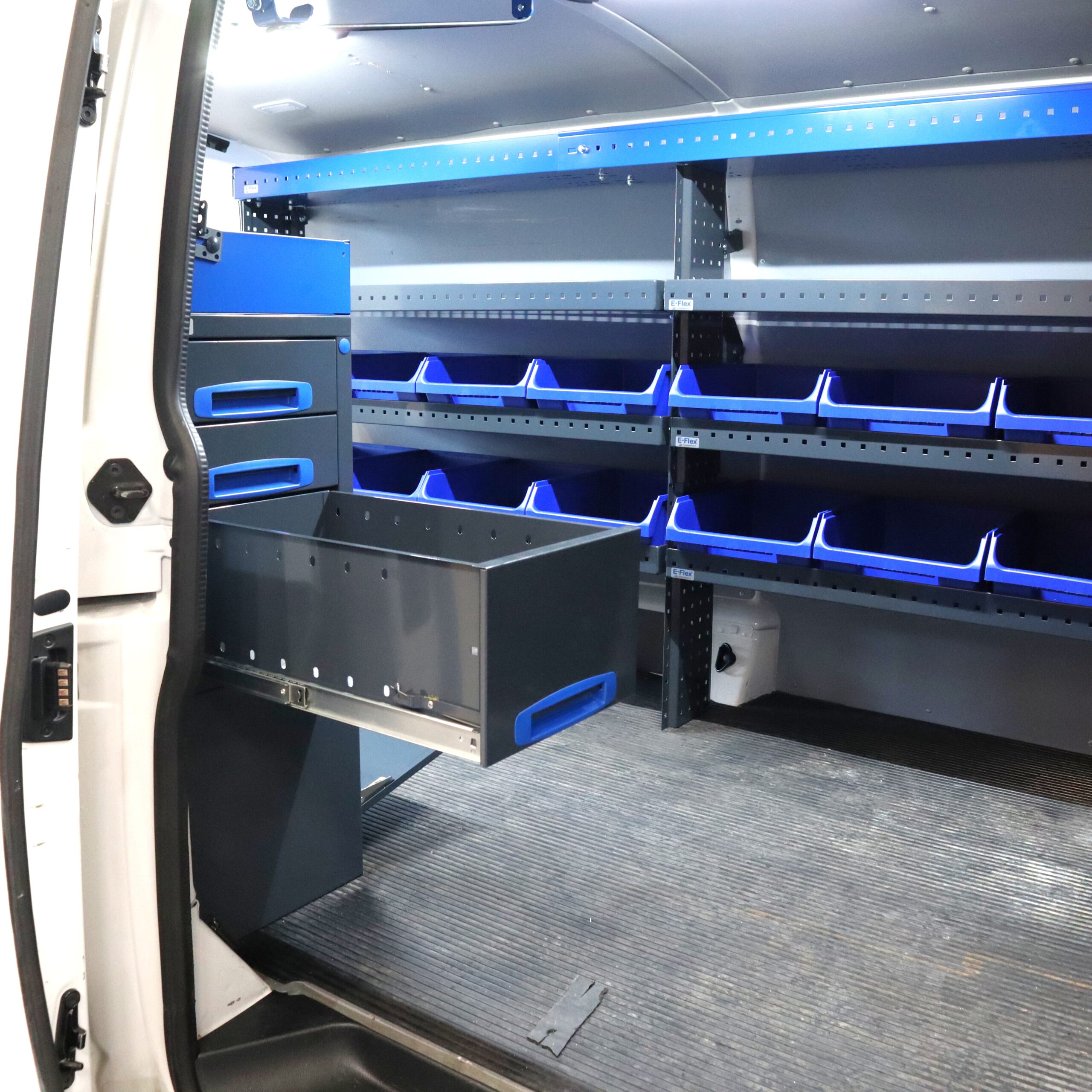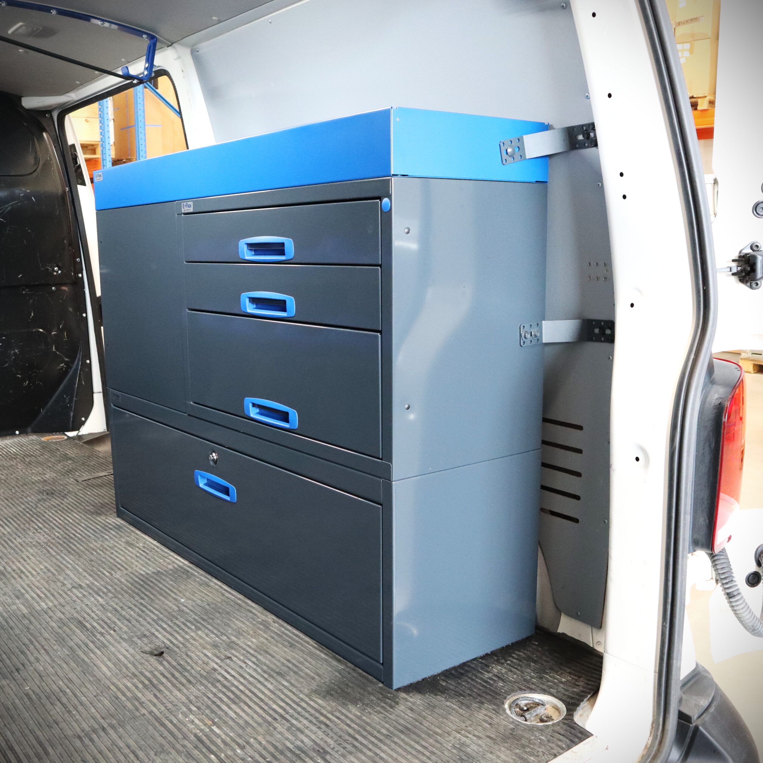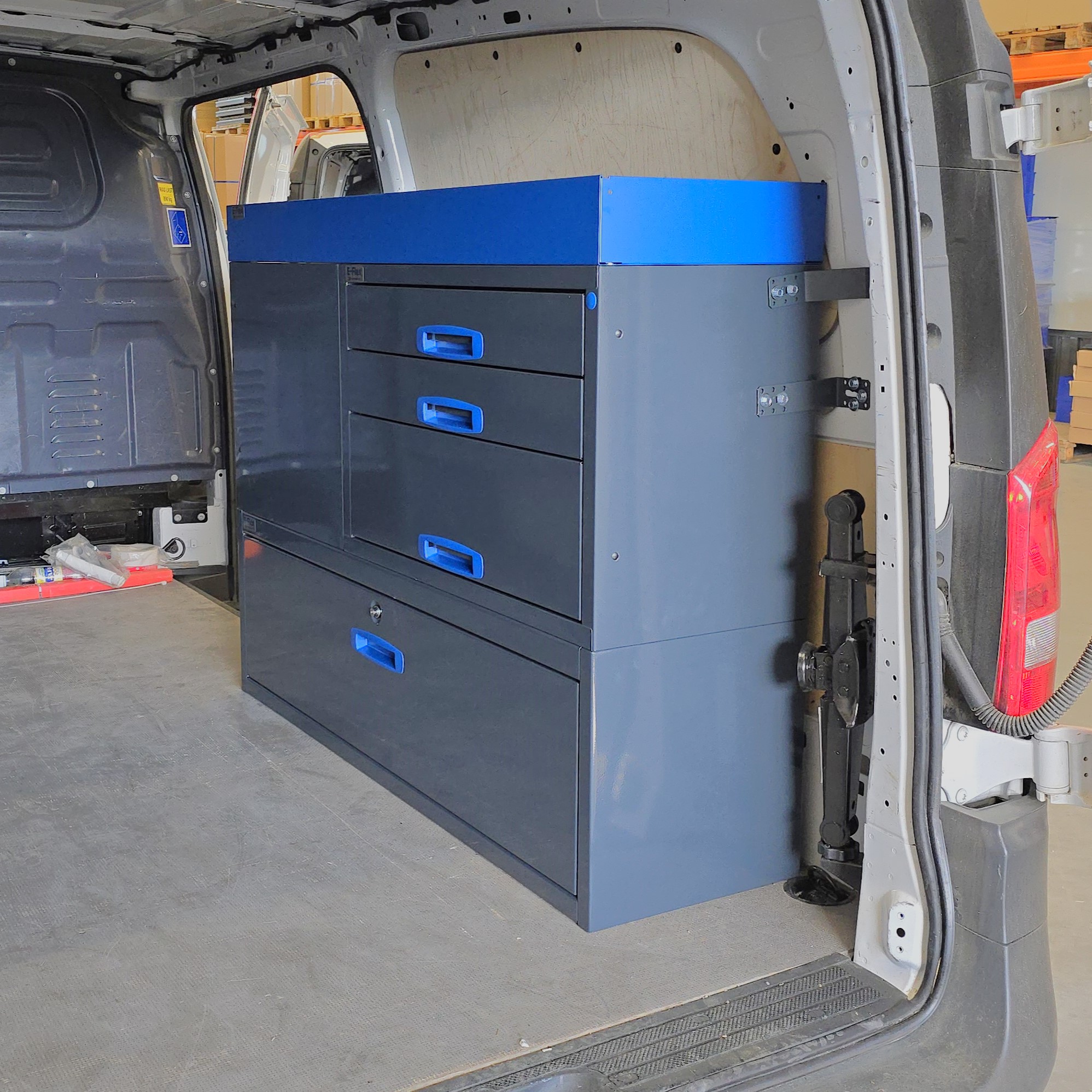 Jämerät E-Flex pakettiauton hyllyköt / laatikostot ovat suosittuja ja monipuolisia pakettiauton kalusteita. Kalusteessa on yhdistetty vetolaatikoita, avohyllyjä ja muita säilytystiloja. Hyllykkö- / laatikostojen pääväri on pulverimaalattu antrasiitti ja toisena värinä on tyylikäs pulverimaalattu sininen. Moduuleista koosttuvat tuotekokonaisuudet on helppo ja selkeä kasata sekä asentaa. Tuotekokonaisuudet ovat moduulirakenteensa vuoksi myös hyvin muunneltavissa. Vetolaatikostojen kiskot ovat kuulalaakeroituja (kantavuus 40 kg) ja tehty nimenomaan pakettiautoja varten eli laatikot lukittuvat paikalleen sekä auki että kiinni -asennoissa eivätkä aukeile itsekseen ajon aikana. Annamme tuotteille 10 vuoden takuun, joka takaa että nämä todella kestävät vaativammassakin ammattikäytössä. Täydennä kalusteesi tarvittavilla lisävarusteilla.