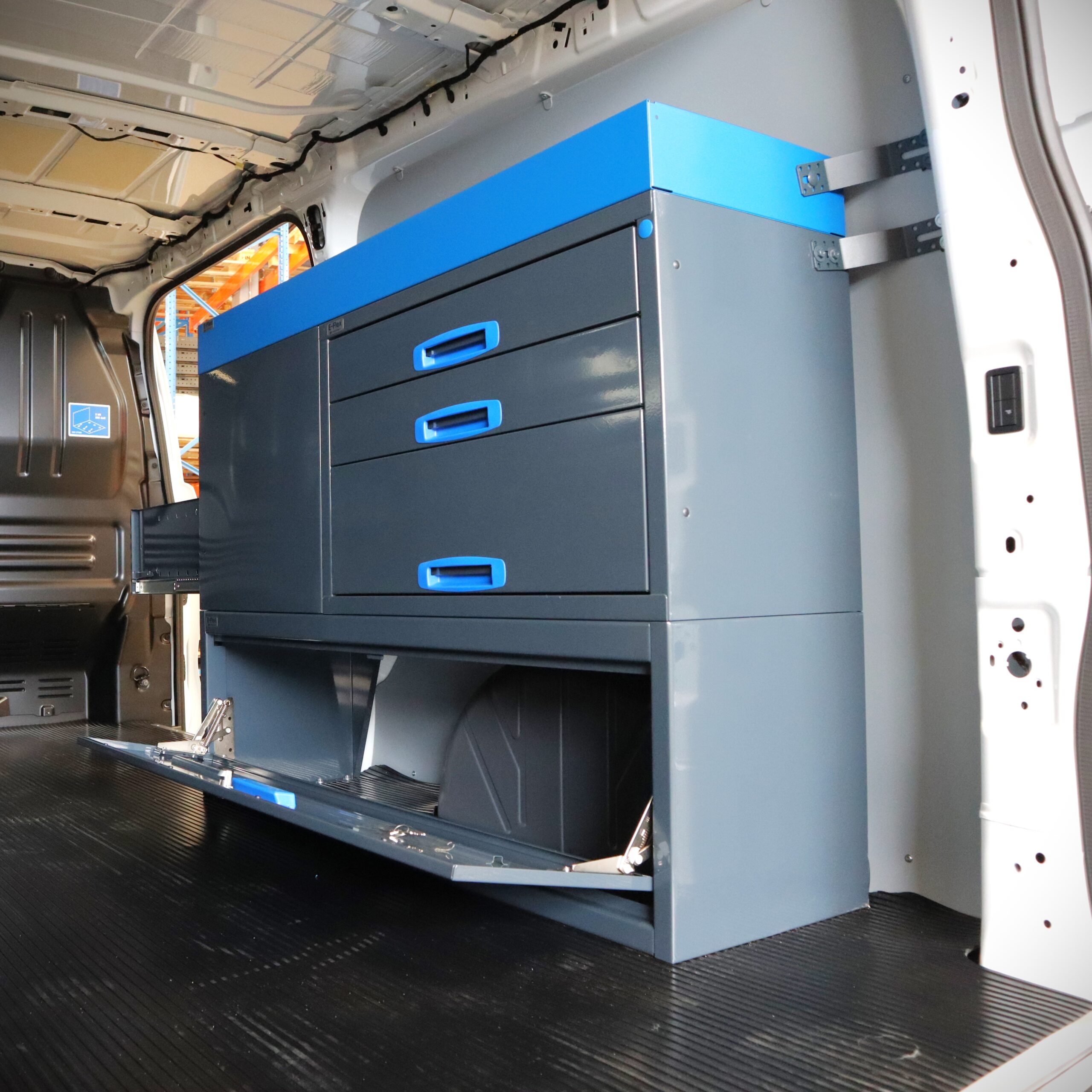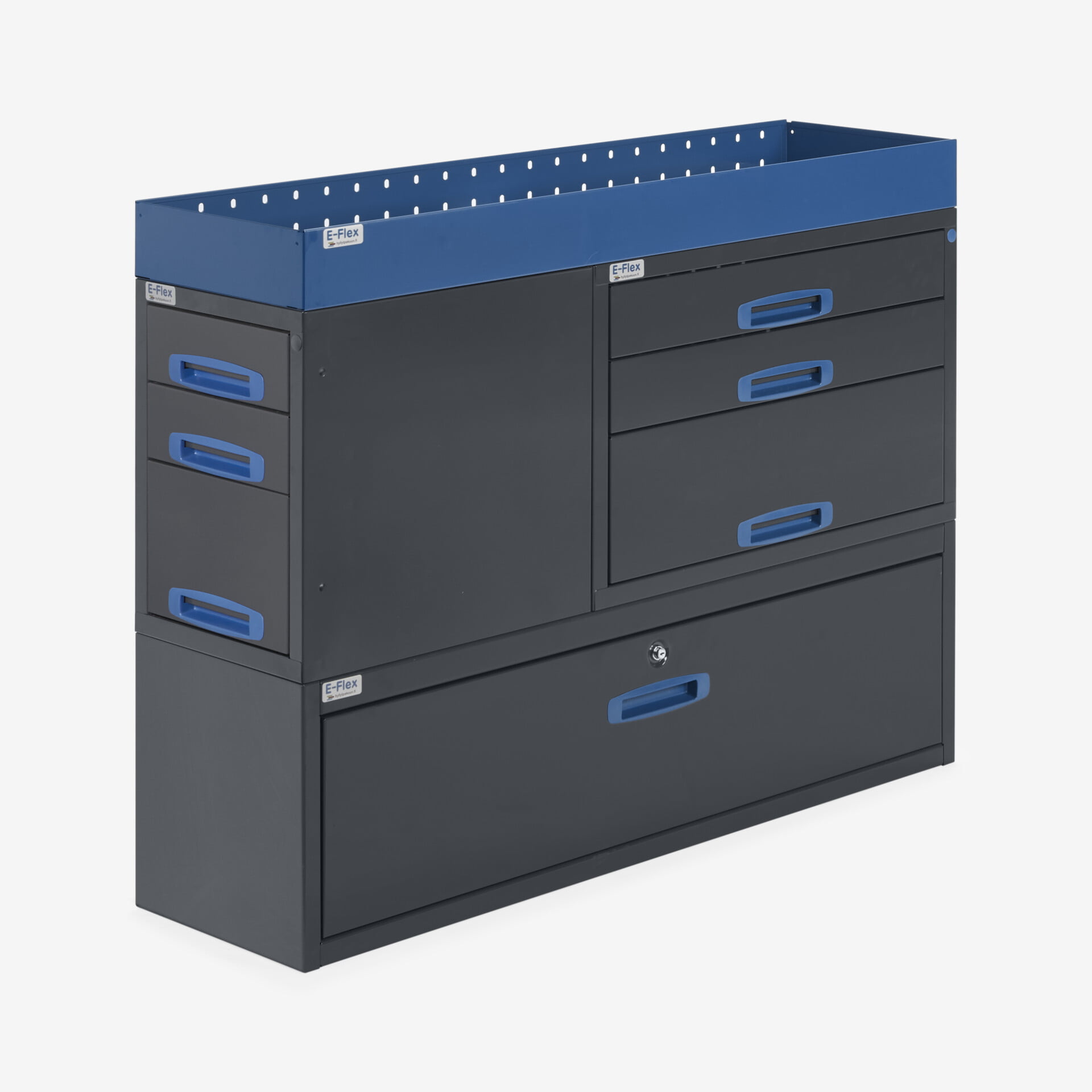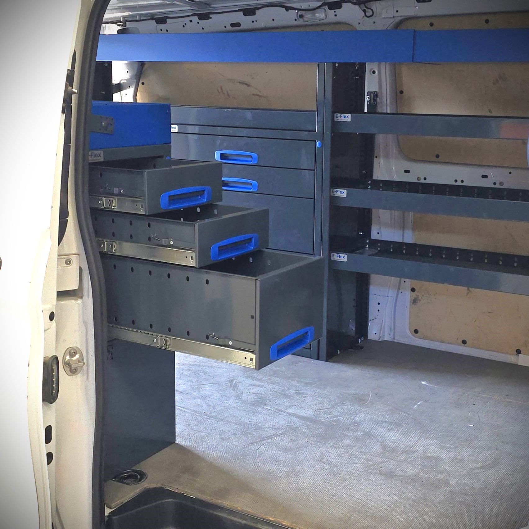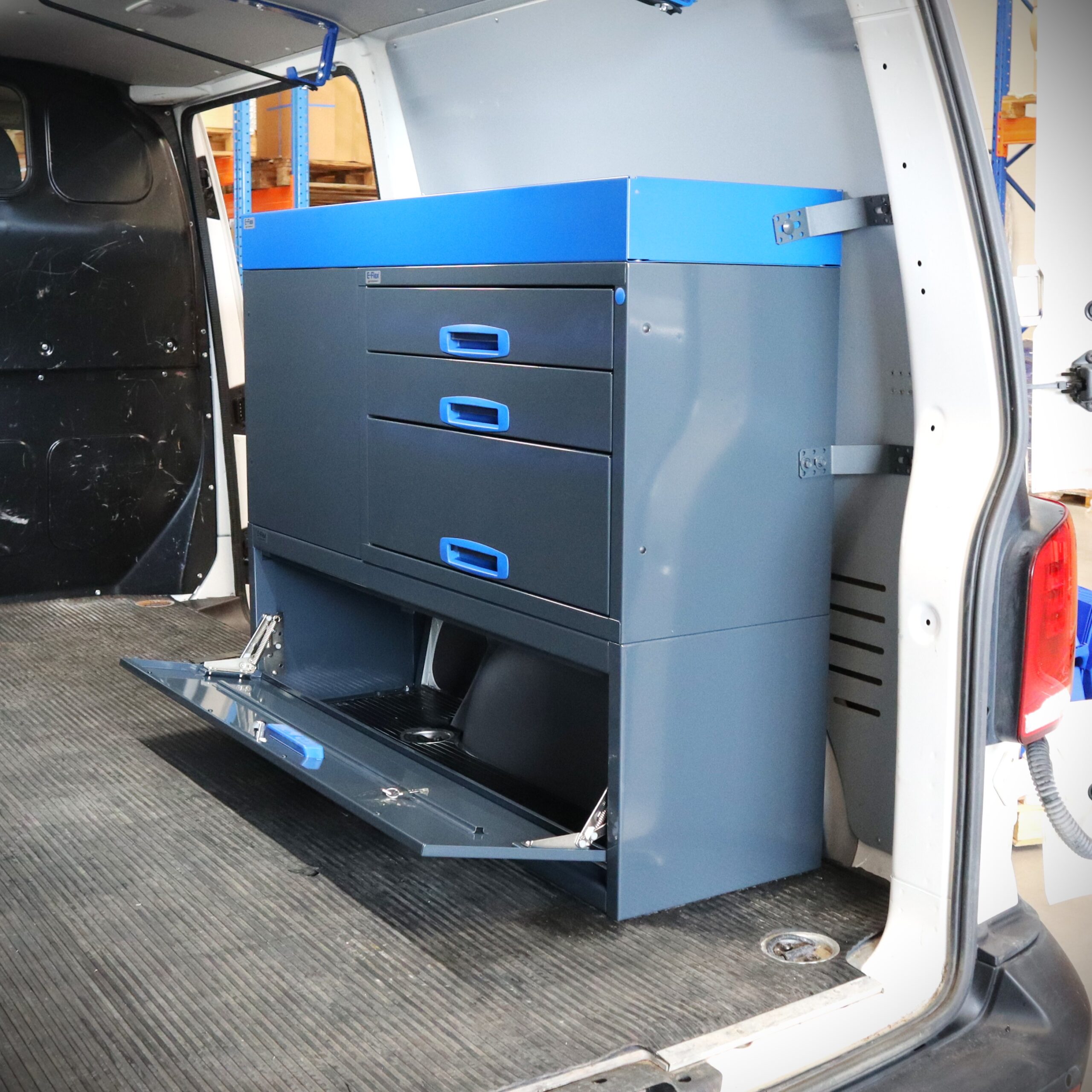 Jämerät E-Flex pakettiauton hyllyköt / laatikostot ovat suosittuja ja monipuolisia pakettiauton kalusteita. Kalusteessa on yhdistetty vetolaatikoita, avohyllyjä ja muita säilytystiloja. Hyllykkö- / laatikostojen pääväri on pulverimaalattu antrasiitti ja toisena värinä on tyylikäs pulverimaalattu sininen. Moduuleista koosttuvat tuotekokonaisuudet on helppo ja selkeä kasata sekä asentaa. Tuotekokonaisuudet ovat moduulirakenteensa vuoksi myös hyvin muunneltavissa. Vetolaatikostojen kiskot ovat kuulalaakeroituja (kantavuus 40 kg) ja tehty nimenomaan pakettiautoja varten eli laatikot lukittuvat paikalleen sekä auki että kiinni -asennoissa eivätkä aukeile itsekseen ajon aikana. Annamme tuotteille 10 vuoden takuun, joka takaa että nämä todella kestävät vaativammassakin ammattikäytössä. Täydennä kalusteesi tarvittavilla lisävarusteilla.