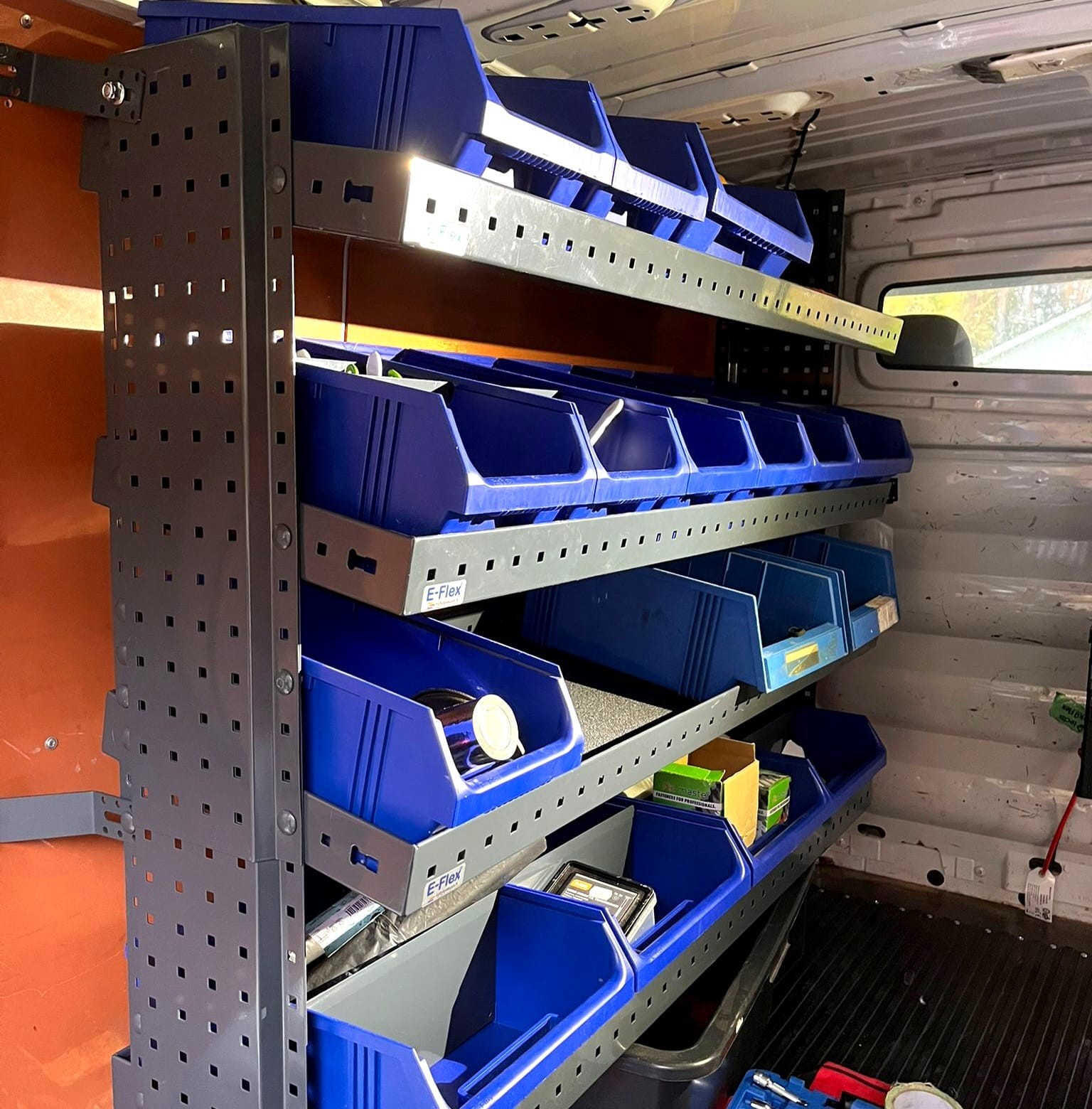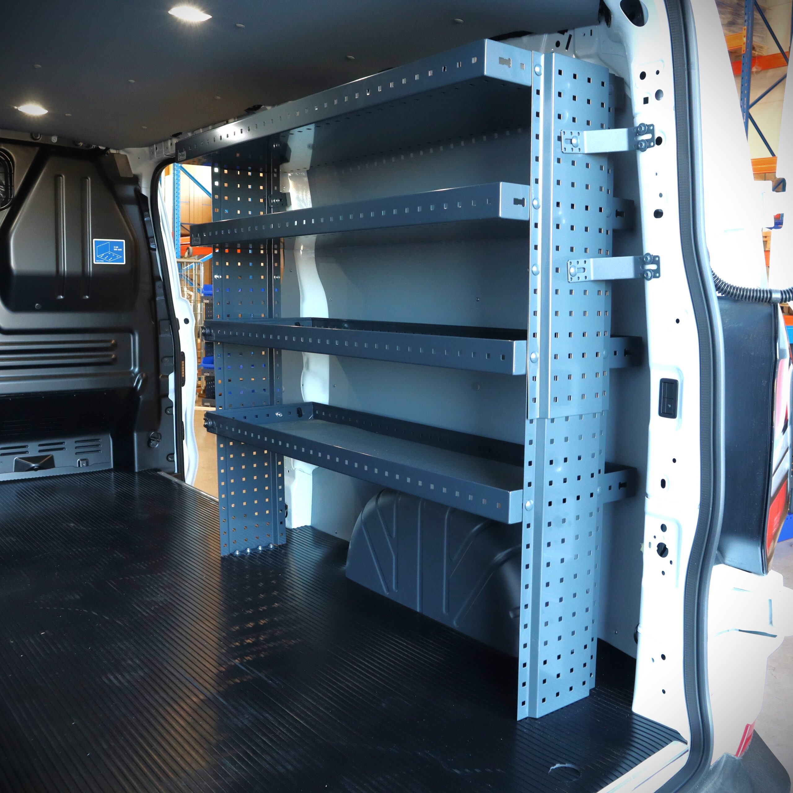 E-Flex 130 cm pakettiauton hylly neljällä korkeus-säädettävällä hyllytasolla. Avohylly pitää pakettiauton järjestyksessä tyylikkäästi ja helposti.