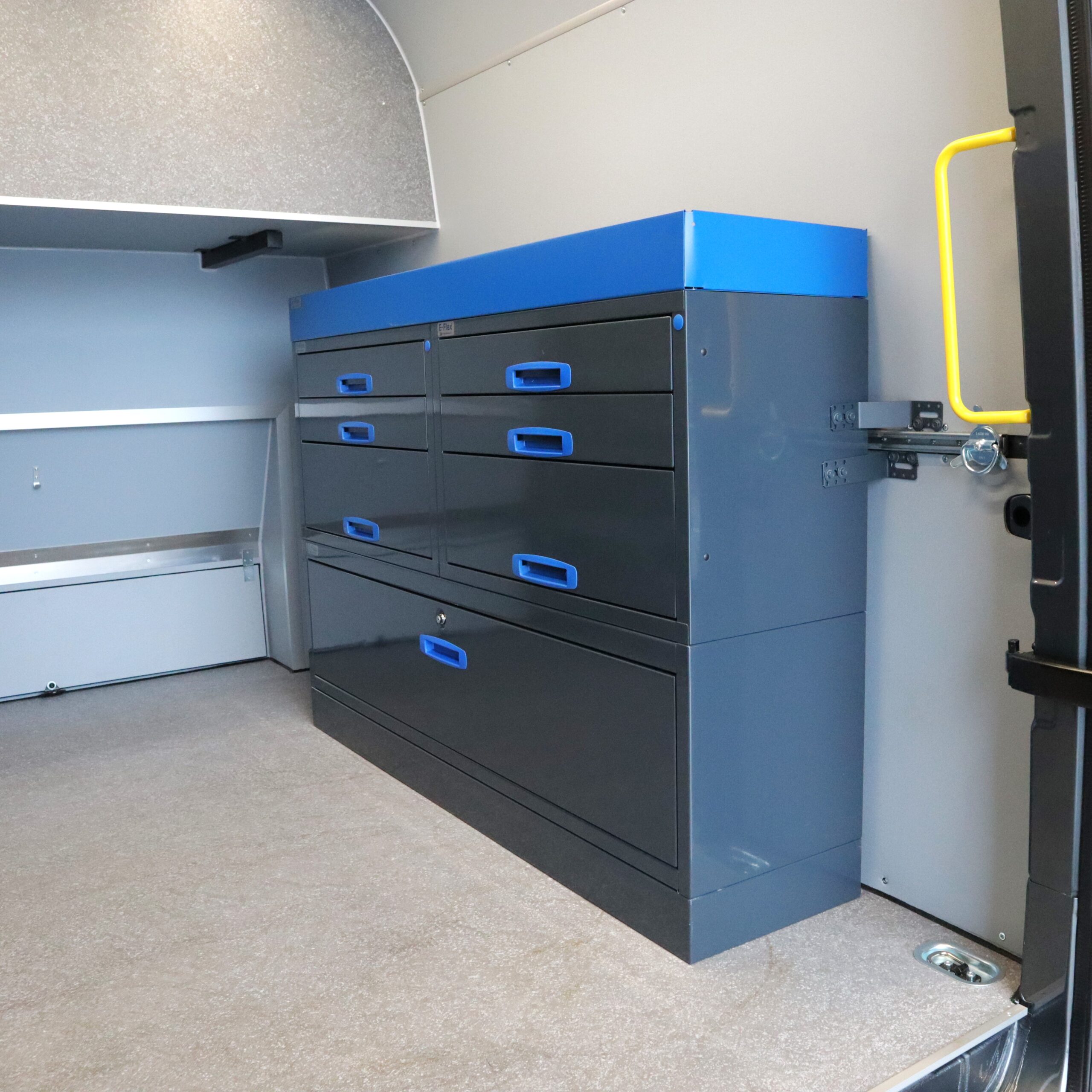 Laadukas kuulalaakeroitu vetolaatikosto pitää tavaran järjestyksessä omalla paikallaan ja tekee pakettiauton käytöstä oikeasti kivaa. Tässä vielä ISO alakaappi, johon saat yllättävän paljon romua piilotettua.