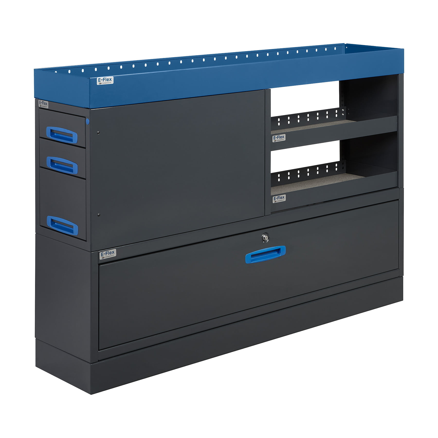 Jämerät E-Flex pakettiauton hyllyköt / laatikostot ovat suosittuja ja monipuolisia pakettiauton kalusteita. Kalusteessa on yhdistetty vetolaatikoita, avohyllyjä ja muita säilytystiloja. Hyllykkö- / laatikostojen pääväri on pulverimaalattu antrasiitti ja toisena värinä on tyylikäs pulverimaalattu sininen. Moduuleista koosttuvat tuotekokonaisuudet on helppo ja selkeä kasata sekä asentaa. Tuotekokonaisuudet ovat moduulirakenteensa vuoksi myös hyvin muunneltavissa. Vetolaatikostojen kiskot ovat kuulalaakeroituja (kantavuus 40 kg) ja tehty nimenomaan pakettiautoja varten eli laatikot lukittuvat paikalleen sekä auki että kiinni -asennoissa eivätkä aukeile itsekseen ajon aikana. Annamme tuotteille 10 vuoden takuun, joka takaa että nämä todella kestävät vaativammassakin ammattikäytössä. Täydennä kalusteesi tarvittavilla lisävarusteilla.