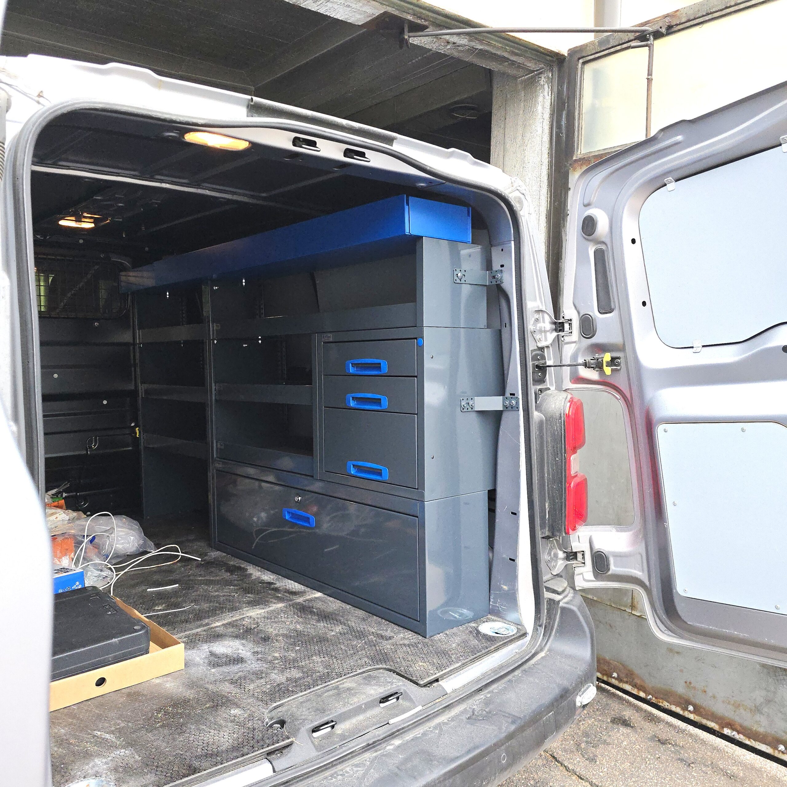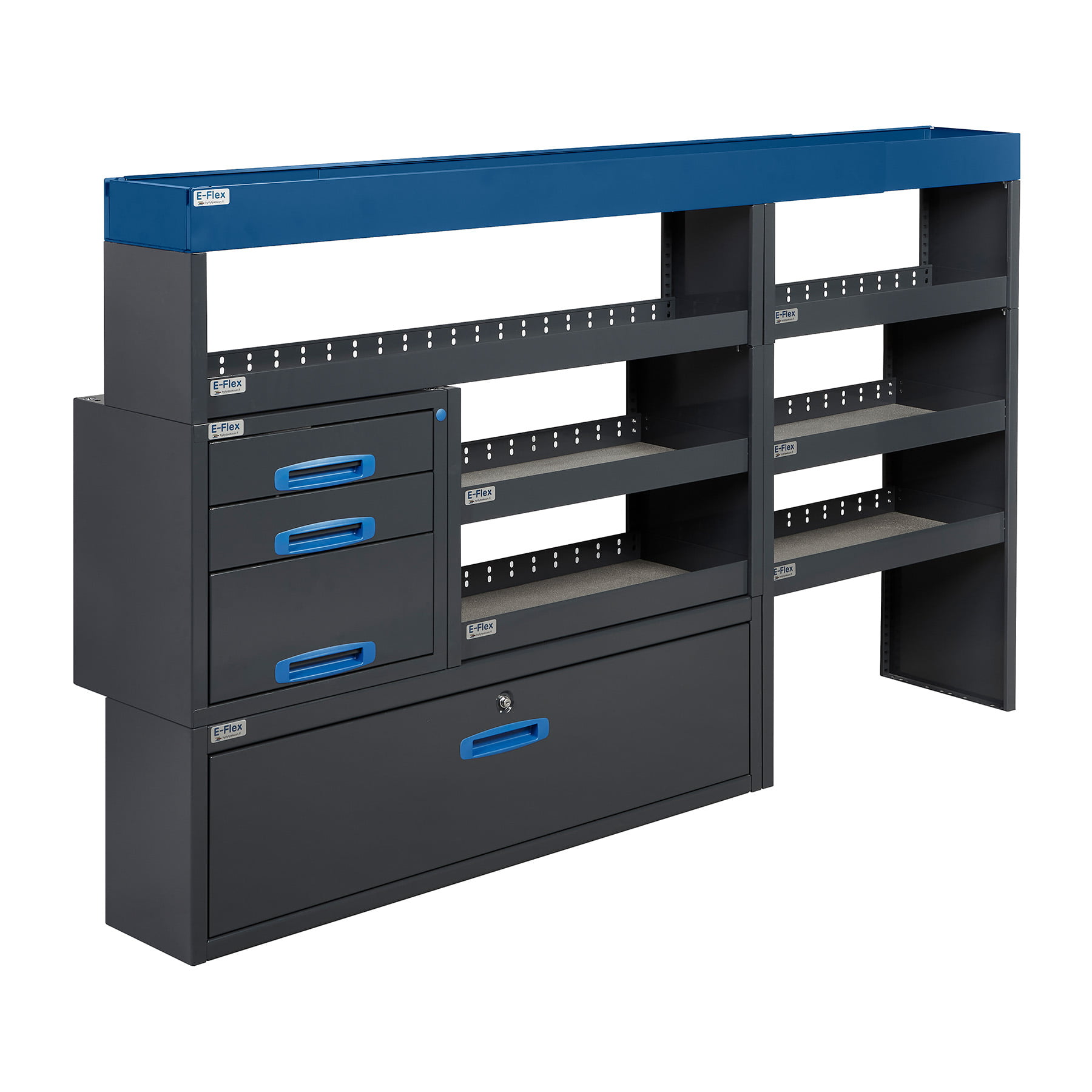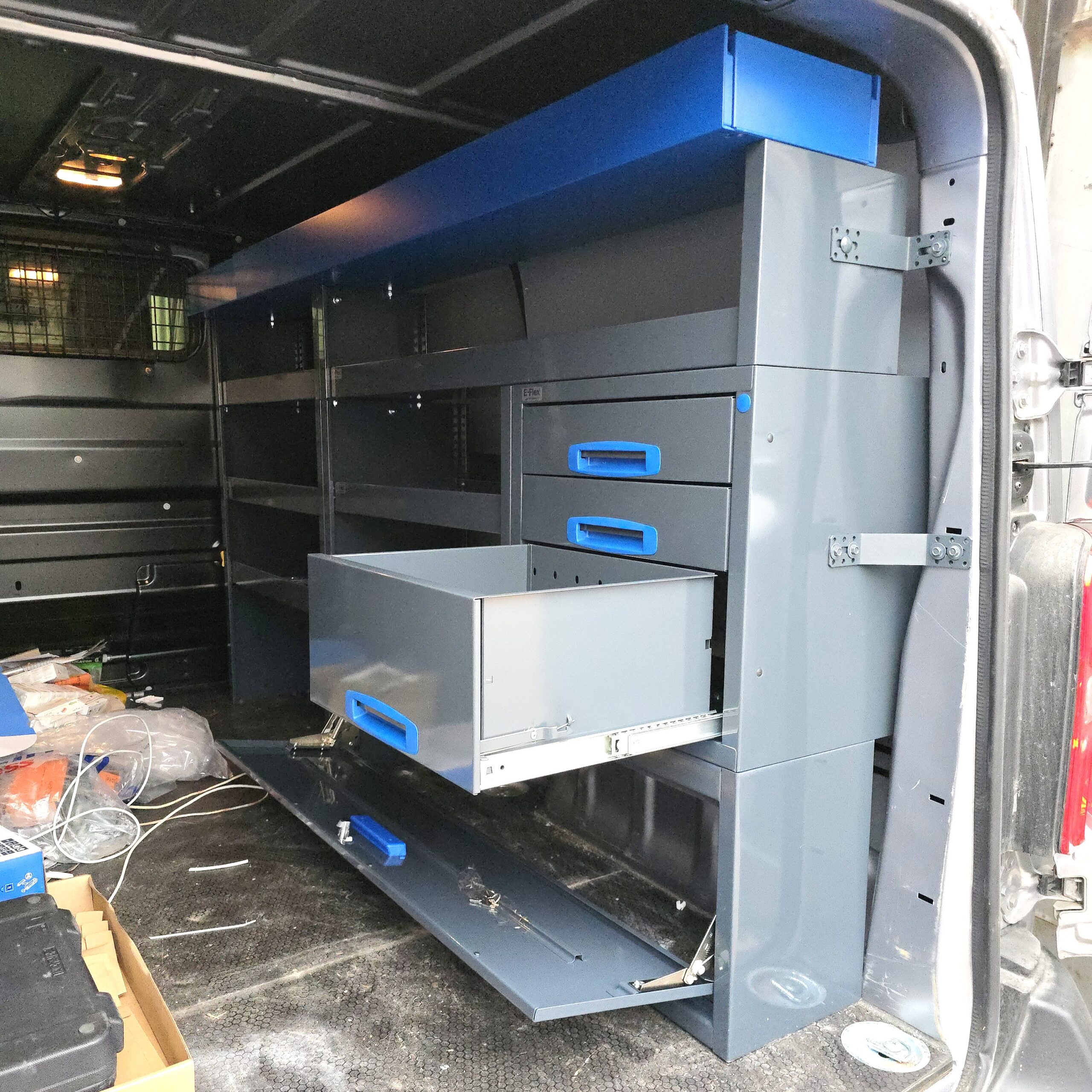 Jämerät E-Flex pakettiauton hyllyköt / laatikostot ovat suosittuja ja monipuolisia pakettiauton kalusteita. Kalusteessa on yhdistetty vetolaatikoita, avohyllyjä ja muita säilytystiloja. Hyllykkö- / laatikostojen pääväri on pulverimaalattu antrasiitti ja toisena värinä on tyylikäs pulverimaalattu sininen. Moduuleista koosttuvat tuotekokonaisuudet on helppo ja selkeä kasata sekä asentaa. Tuotekokonaisuudet ovat moduulirakenteensa vuoksi myös hyvin muunneltavissa. Vetolaatikostojen kiskot ovat kuulalaakeroituja (kantavuus 40 kg) ja tehty nimenomaan pakettiautoja varten eli laatikot lukittuvat paikalleen sekä auki että kiinni -asennoissa eivätkä aukeile itsekseen ajon aikana. Annamme tuotteille 10 vuoden takuun, joka takaa että nämä todella kestävät vaativammassakin ammattikäytössä. Täydennä kalusteesi tarvittavilla lisävarusteilla.