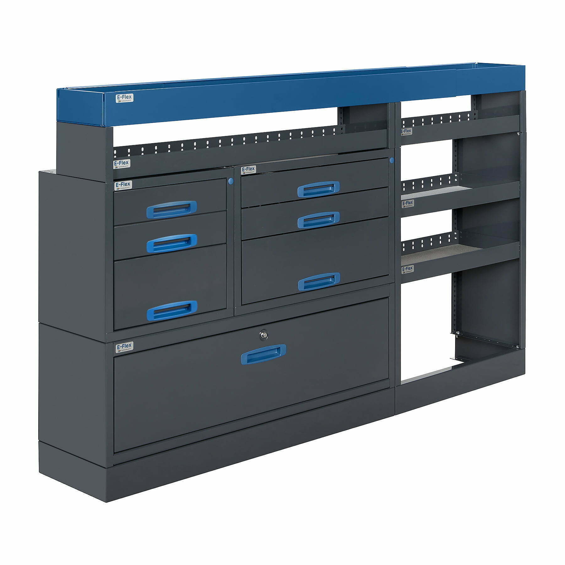 Jämerät E-Flex pakettiauton hyllyköt / laatikostot ovat suosittuja ja monipuolisia pakettiauton kalusteita. Kalusteessa on yhdistetty vetolaatikoita, avohyllyjä ja muita säilytystiloja. Hyllykkö- / laatikostojen pääväri on pulverimaalattu antrasiitti ja toisena värinä on tyylikäs pulverimaalattu sininen. Moduuleista koosttuvat tuotekokonaisuudet on helppo ja selkeä kasata sekä asentaa. Tuotekokonaisuudet ovat moduulirakenteensa vuoksi myös hyvin muunneltavissa. Vetolaatikostojen kiskot ovat kuulalaakeroituja (kantavuus 40 kg) ja tehty nimenomaan pakettiautoja varten eli laatikot lukittuvat paikalleen sekä auki että kiinni -asennoissa eivätkä aukeile itsekseen ajon aikana. Annamme tuotteille 10 vuoden takuun, joka takaa että nämä todella kestävät vaativammassakin ammattikäytössä. Täydennä kalusteesi tarvittavilla lisävarusteilla.