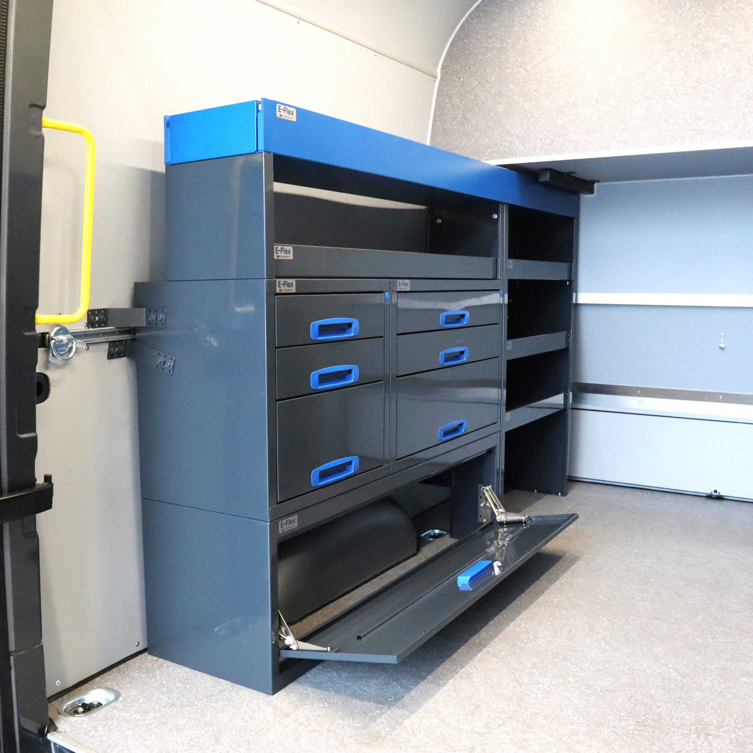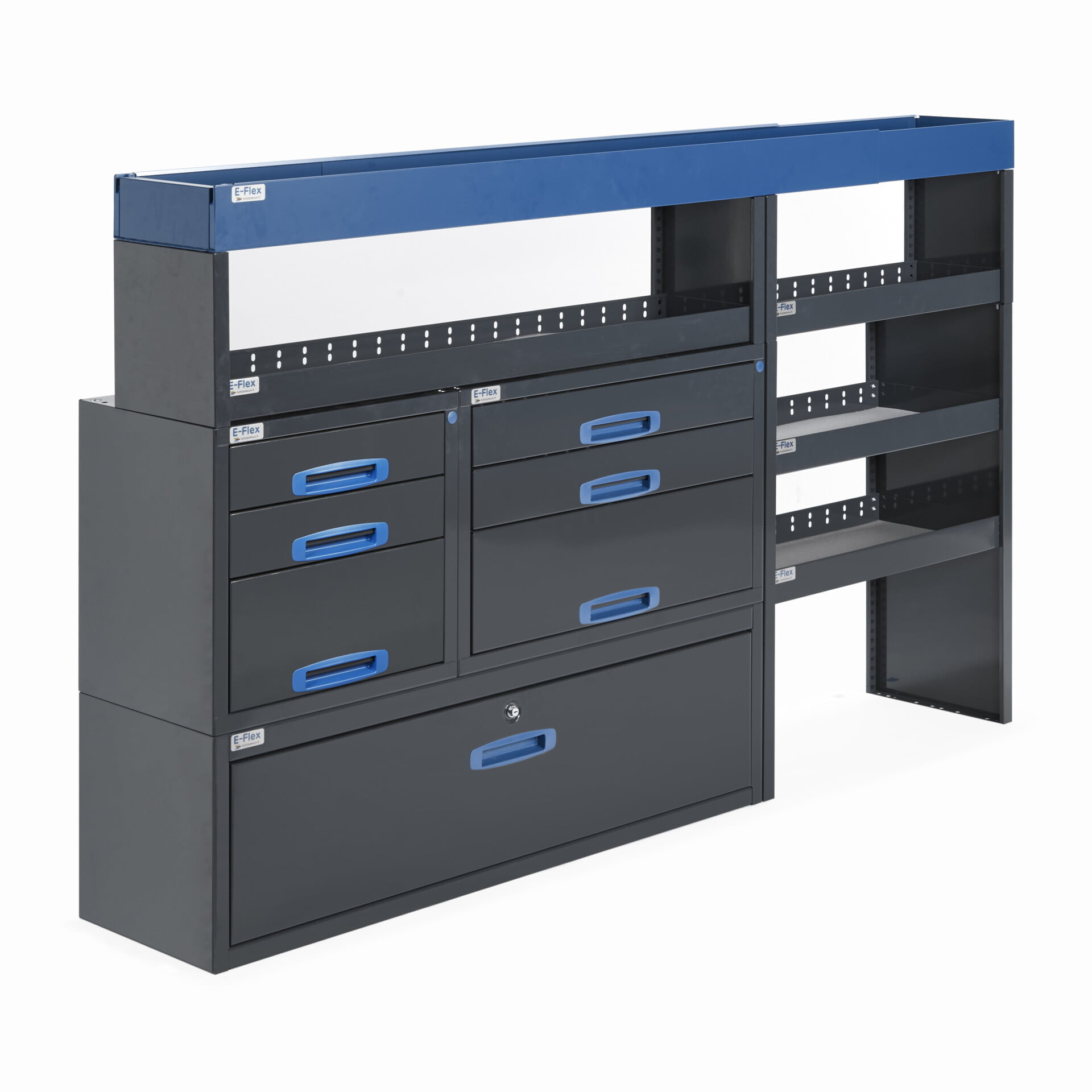 Tämä hyllyjärjestelmä on suunniteltu L1H1-kokoluokan pakettiautoihin ja sopii erityisesti malleihin Ford Transit Custom L1 lyhyt, M-B Vito keskipitkä, Nissan Primastar lyhyt, Renault Trafic lyhyt ja VW Transporter lyhyt.. Järjestelmä yhdistää vetolaatikot, avohyllyt ja säilytystilat, tarjoten monipuolisen ja muunneltavan säilytysratkaisun ammattilaiskäyttöön. Pulverimaalattu antrasiitti ja sininen väri tekevät siitä tyylikkään ja kestävän vaihtoehdon. Kuulalaakeroidut vetolaatikot lukittuvat turvallisesti eivätkä aukea ajon aikana. Tuotteelle myönnetään 10 vuoden takuu, mikä takaa sen kestävyyden vaativissakin olosuhteissa.Täydennä kalusteesi tarvittavilla lisävarusteilla.Täydennä kalusteesi tarvittavilla lisävarusteilla.
