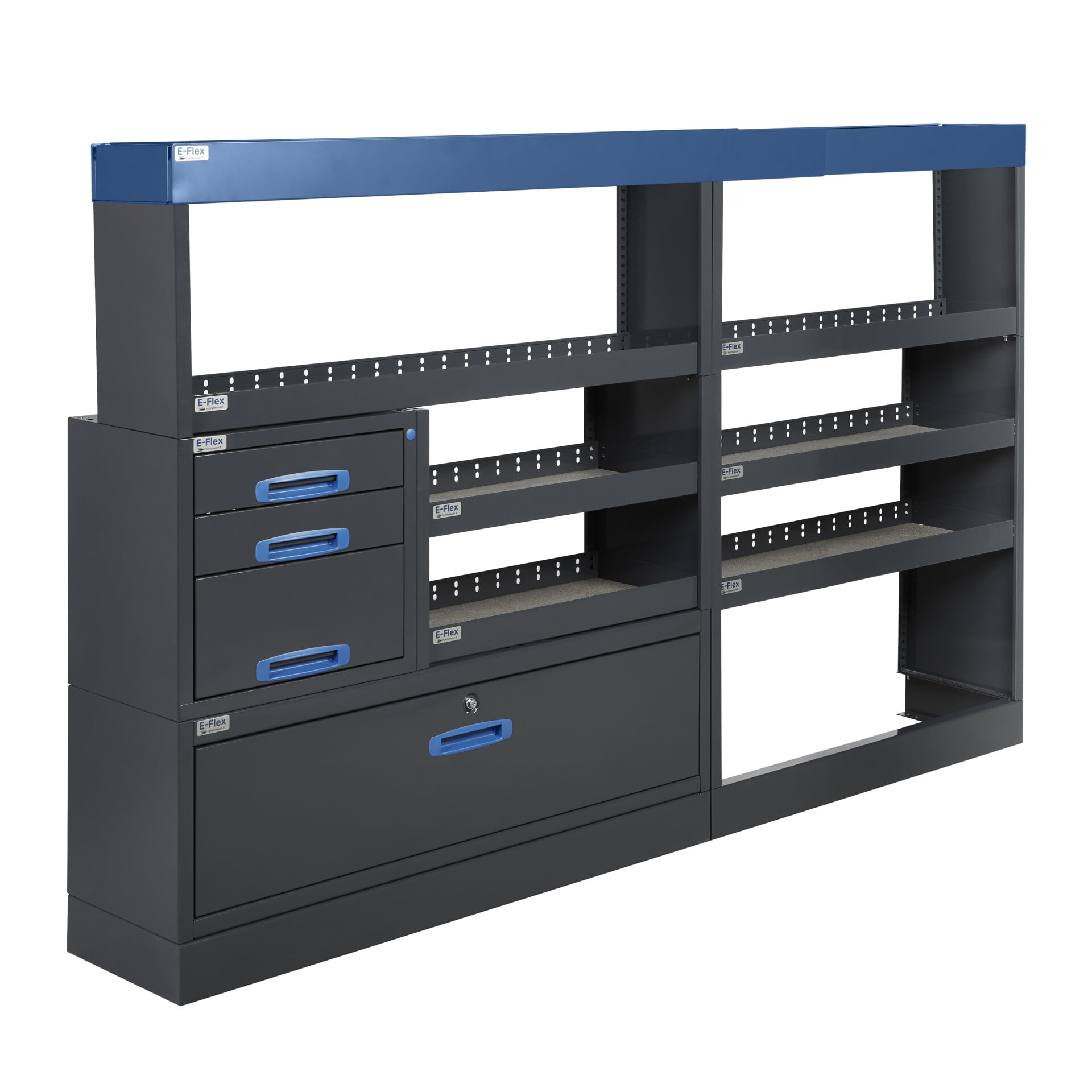 Jämerät E-Flex pakettiauton hyllyköt / laatikostot ovat suosittuja ja monipuolisia pakettiauton kalusteita. Kalusteessa on yhdistetty vetolaatikoita, avohyllyjä ja muita säilytystiloja. Hyllykkö- / laatikostojen pääväri on pulverimaalattu antrasiitti ja toisena värinä on tyylikäs pulverimaalattu sininen. Moduuleista koosttuvat tuotekokonaisuudet on helppo ja selkeä kasata sekä asentaa. Tuotekokonaisuudet ovat moduulirakenteensa vuoksi myös hyvin muunneltavissa. Vetolaatikostojen kiskot ovat kuulalaakeroituja (kantavuus 40 kg) ja tehty nimenomaan pakettiautoja varten eli laatikot lukittuvat paikalleen sekä auki että kiinni -asennoissa eivätkä aukeile itsekseen ajon aikana. Annamme tuotteille 10 vuoden takuun, joka takaa että nämä todella kestävät vaativammassakin ammattikäytössä. Täydennä kalusteesi tarvittavilla lisävarusteilla.
