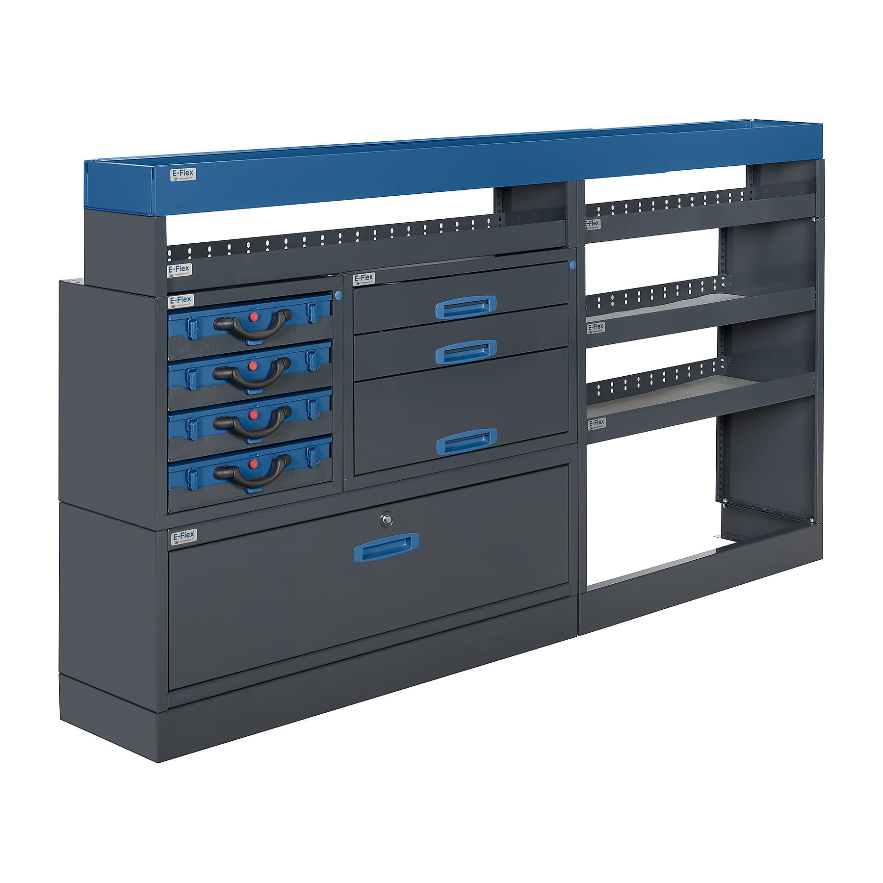 Jämerät E-Flex pakettiauton hyllyköt / laatikostot ovat suosittuja ja monipuolisia pakettiauton kalusteita. Kalusteessa on yhdistetty vetolaatikoita, avohyllyjä ja muita säilytystiloja. Hyllykkö- / laatikostojen pääväri on pulverimaalattu antrasiitti ja toisena värinä on tyylikäs pulverimaalattu sininen. Moduuleista koosttuvat tuotekokonaisuudet on helppo ja selkeä kasata sekä asentaa. Tuotekokonaisuudet ovat moduulirakenteensa vuoksi myös hyvin muunneltavissa. Vetolaatikostojen kiskot ovat kuulalaakeroituja (kantavuus 40 kg) ja tehty nimenomaan pakettiautoja varten eli laatikot lukittuvat paikalleen sekä auki että kiinni -asennoissa eivätkä aukeile itsekseen ajon aikana. Annamme tuotteille 10 vuoden takuun, joka takaa että nämä todella kestävät vaativammassakin ammattikäytössä. Täydennä kalusteesi tarvittavilla lisävarusteilla.