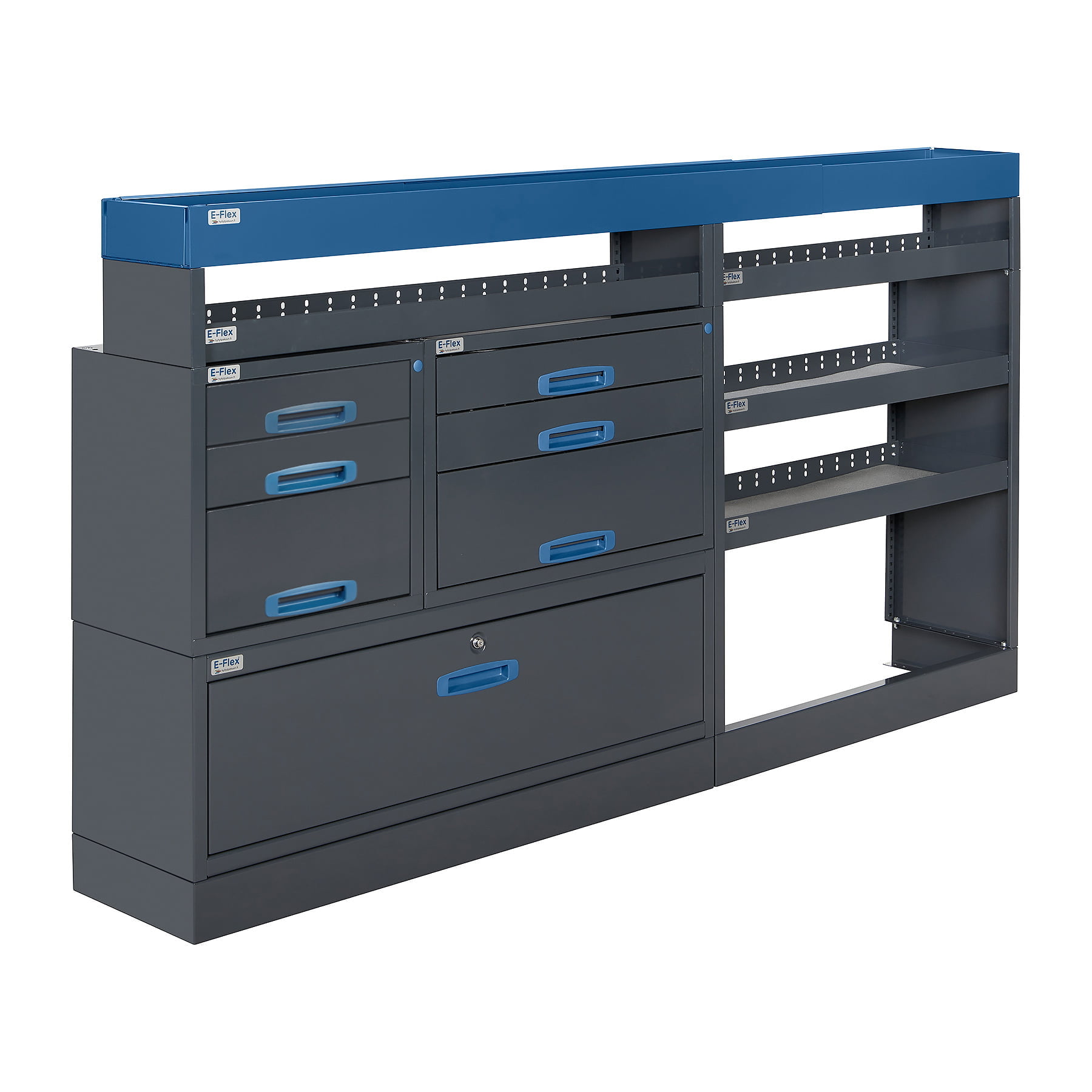 Jämerät E-Flex pakettiauton hyllyköt / laatikostot ovat suosittuja ja monipuolisia pakettiauton kalusteita. Kalusteessa on yhdistetty vetolaatikoita, avohyllyjä ja muita säilytystiloja. Hyllykkö- / laatikostojen pääväri on pulverimaalattu antrasiitti ja toisena värinä on tyylikäs pulverimaalattu sininen. Moduuleista koosttuvat tuotekokonaisuudet on helppo ja selkeä kasata sekä asentaa. Tuotekokonaisuudet ovat moduulirakenteensa vuoksi myös hyvin muunneltavissa. Vetolaatikostojen kiskot ovat kuulalaakeroituja (kantavuus 40 kg) ja tehty nimenomaan pakettiautoja varten eli laatikot lukittuvat paikalleen sekä auki että kiinni -asennoissa eivätkä aukeile itsekseen ajon aikana. Annamme tuotteille 10 vuoden takuun, joka takaa että nämä todella kestävät vaativammassakin ammattikäytössä. Täydennä kalusteesi tarvittavilla lisävarusteilla.