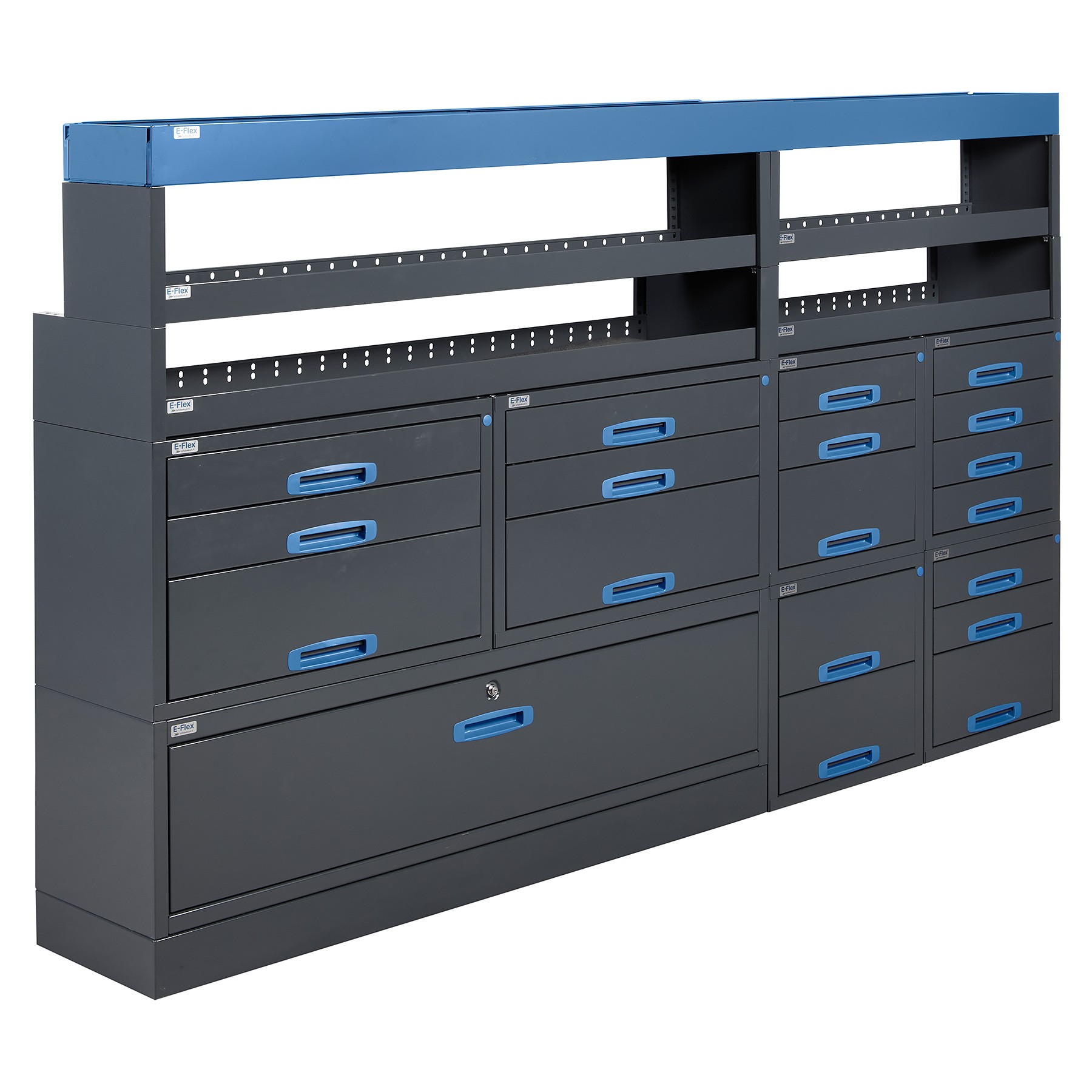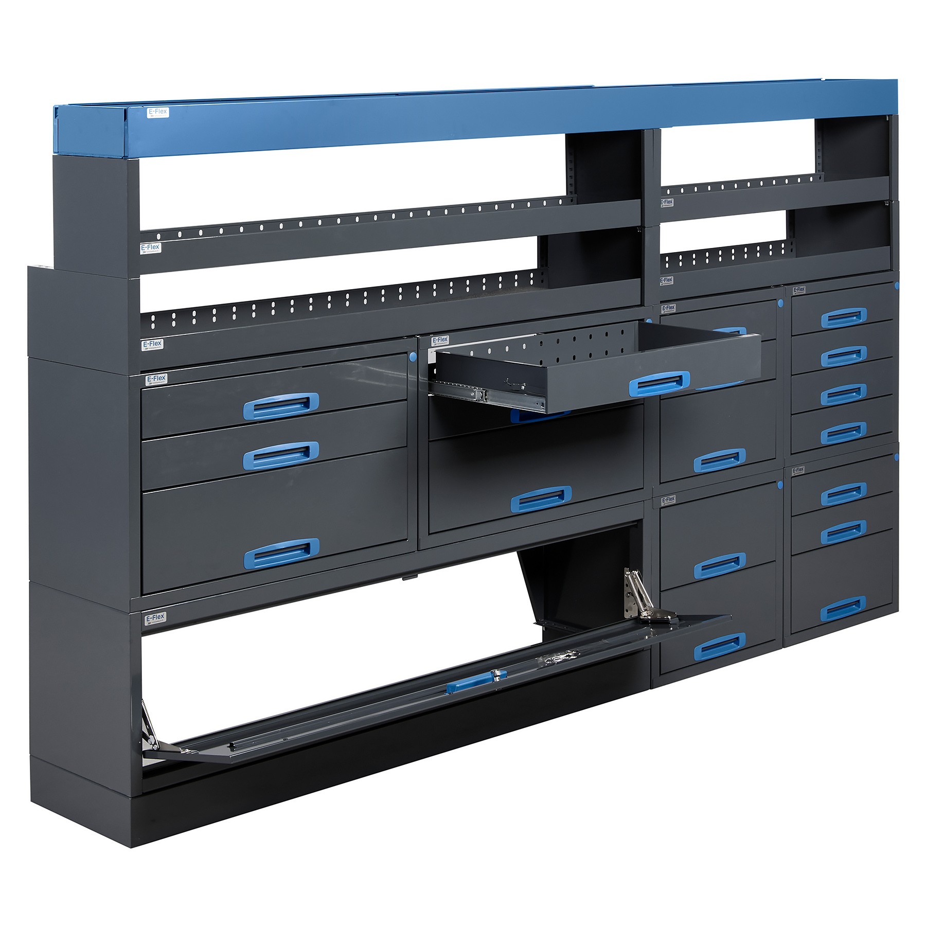 Jämerät E-Flex pakettiauton hyllyköt / laatikostot ovat suosittuja ja monipuolisia pakettiauton kalusteita. Kalusteessa on yhdistetty vetolaatikoita, avohyllyjä ja muita säilytystiloja. Hyllykkö- / laatikostojen pääväri on pulverimaalattu antrasiitti ja toisena värinä on tyylikäs pulverimaalattu sininen. Moduuleista koosttuvat tuotekokonaisuudet on helppo ja selkeä kasata sekä asentaa. Tuotekokonaisuudet ovat moduulirakenteensa vuoksi myös hyvin muunneltavissa. Vetolaatikostojen kiskot ovat kuulalaakeroituja (kantavuus 40 kg) ja tehty nimenomaan pakettiautoja varten eli laatikot lukittuvat paikalleen sekä auki että kiinni -asennoissa eivätkä aukeile itsekseen ajon aikana. Annamme tuotteille 10 vuoden takuun, joka takaa että nämä todella kestävät vaativammassakin ammattikäytössä. Täydennä kalusteesi tarvittavilla lisävarusteilla.