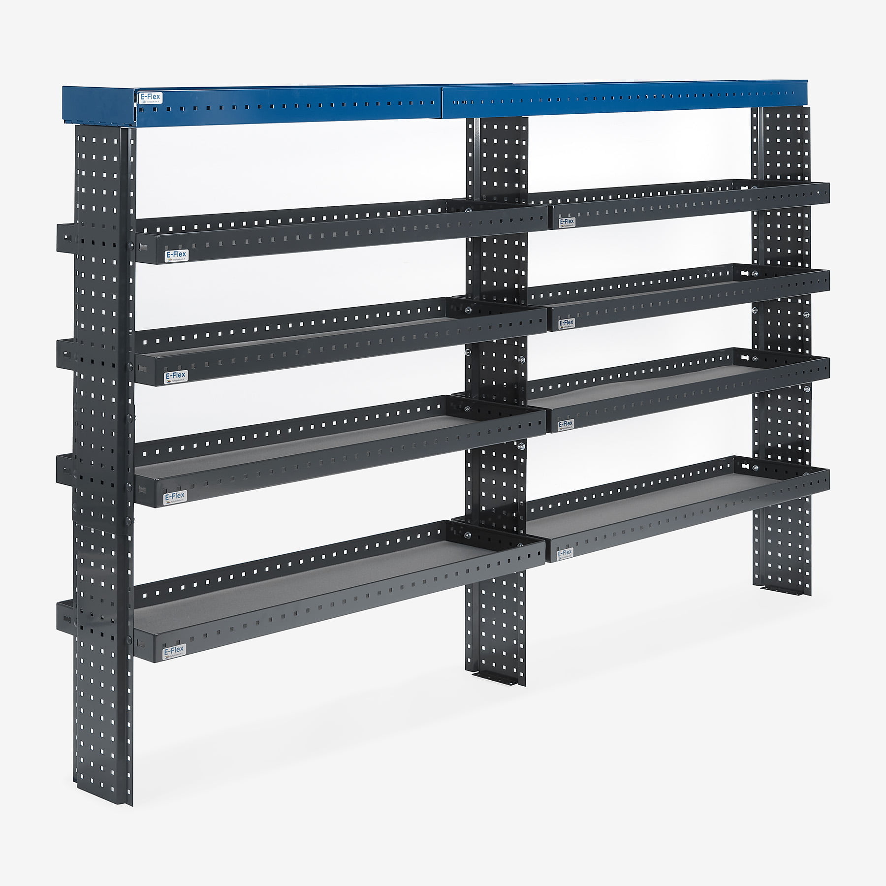 E-Flex 260 cm pakettiauton hylly viidellä korkeus-säädettävällä hyllytasolla. Avohylly pitää pakettiauton järjestyksessä tyylikkäästi ja helposti.