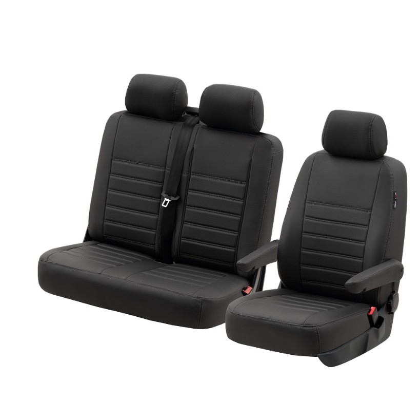 Laadukkaat istuinsuojat Citroen Jumpy 1+2 etupenkkeihin. Reunoissa kestävä keinonahka ja keskiosissa hengittävä kangas joka lisää mukavuutta pitkissä ajoissa. Tämä yhdistelmä suojaa verhoilua kulumiselta, lialta ja nesteiltä samalla kun istuinpinta tuntuu miellyttävältä käytössä.