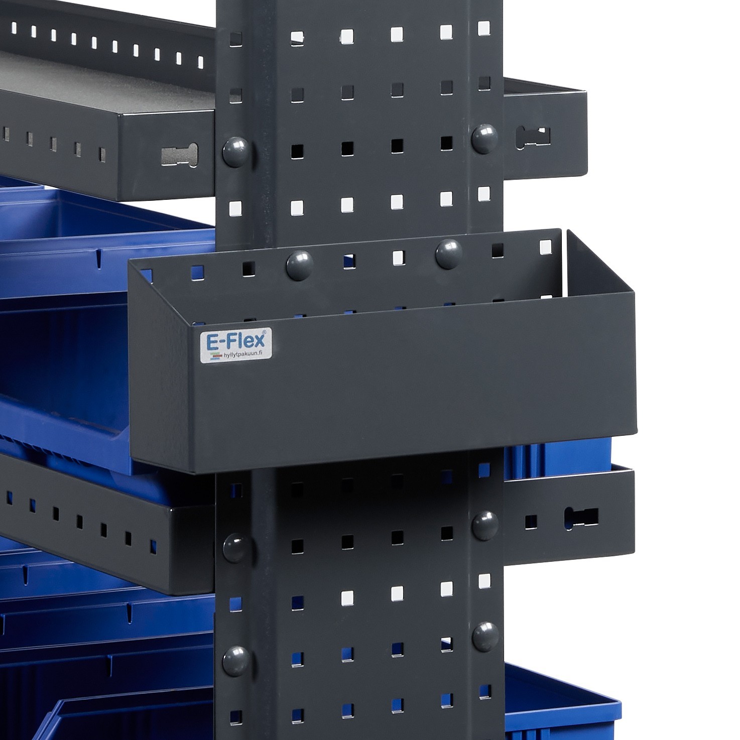 Kotelo voidaan asentaa hyllyn päätyyn, työkalutauluun tai suoraan pakettiauton seinään. Asennus on helppoa ja tukevaa, ja toimitus sisältää 2 kappaletta M8 lukkopultteja sekä 2 kappaletta M8 laippamuttereita, joilla kotelo saadaan kiinnitettyä turvallisesti ilman erillisiä lisäosia. Oikein asennettuna kotelo pysyy tukevasti paikallaan myös ajon aikana.