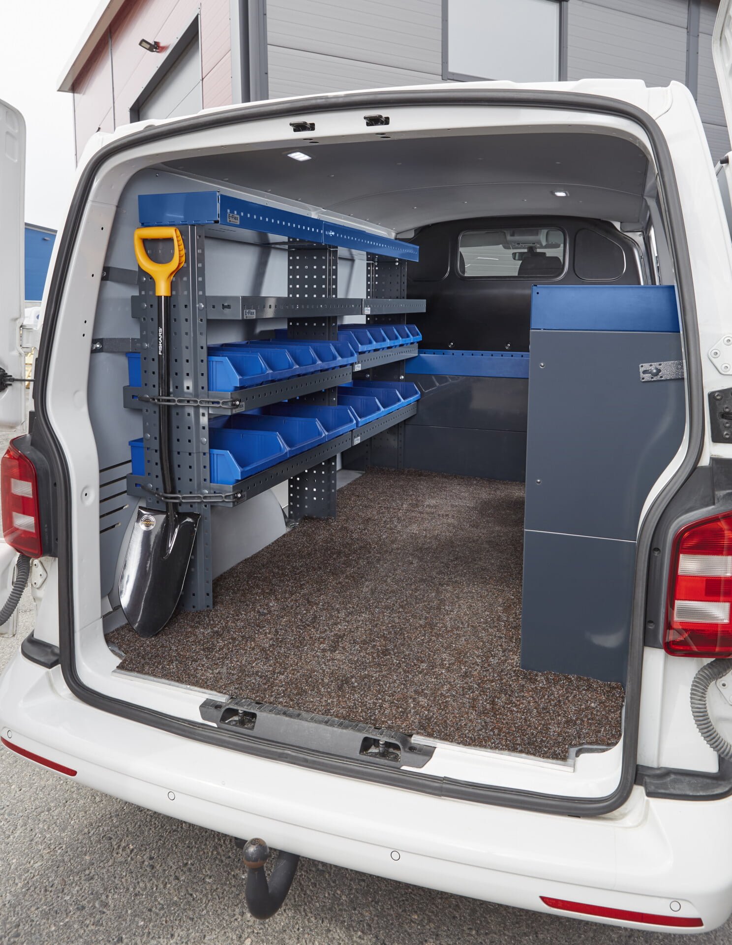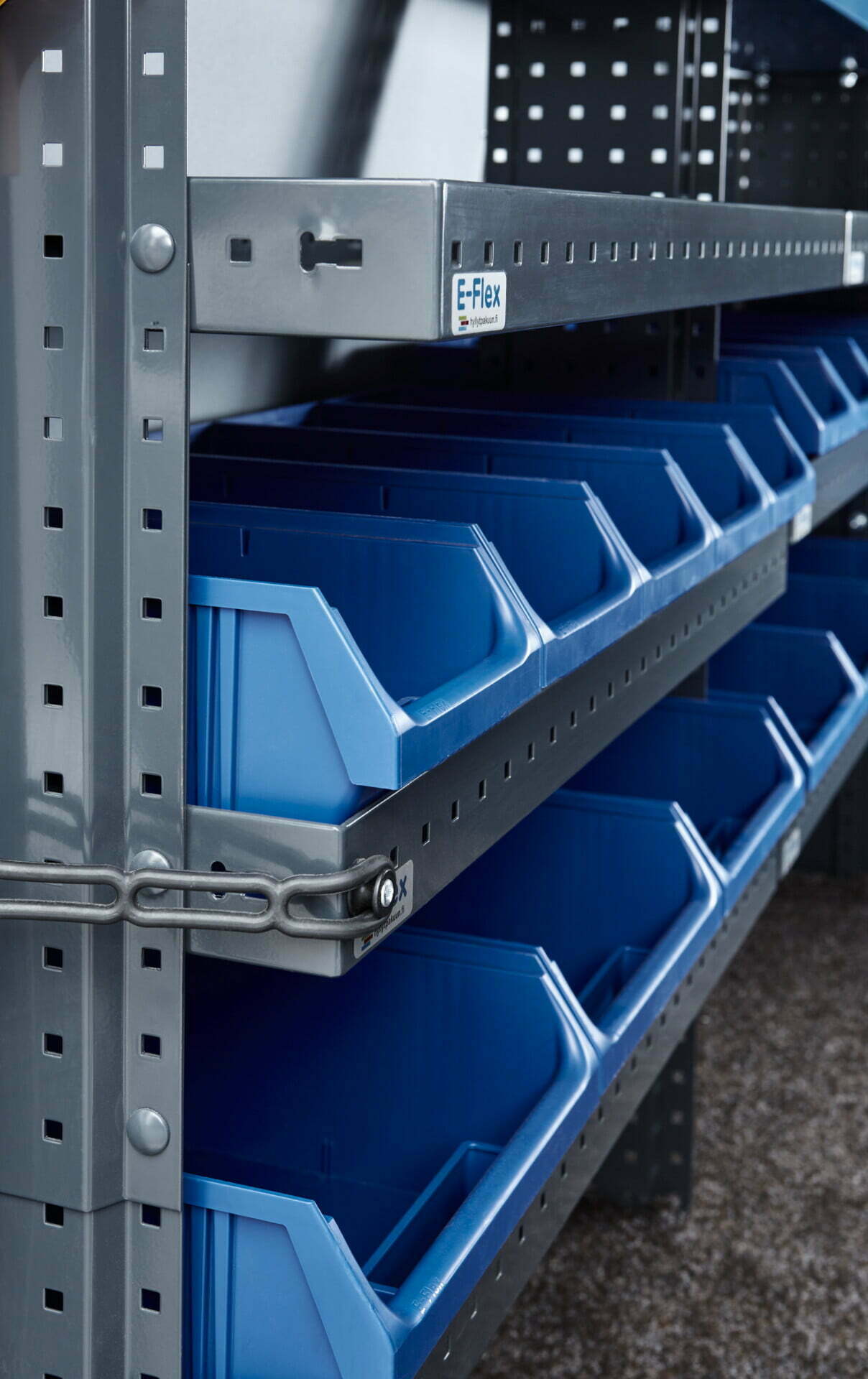 E-Flex hyllylle jämäkästi istuva korkealaatuinen laatikko. Tukeva ja kestävä sininen E-Flex ottolaatikko istuu tukevasti E-Flexin pakettiauton hyllyihin. Suosittu tapa varustella pakettiauto on asettaa seinälle avohyllyt ja niihin ottolaatikoita. Ottolaatikot ovat käytännöllisiä mm. lvi-, ja sähköasentajille ja lukkosepille, joilla on paljon pikkutavaraa mikä pitää saada siististi järjestykseen ja kun pientarvikkeet ovat näkyvillä ottolaatikoissa, niin niiden löytäminen ja tarvikemäärien seuranta on helppoa. Tukevan ja miellyttävän tuntuisen kantokahvan ansioista ottolaatikot on helposti nostettavissa auton hyllyltä myös työmaalle.