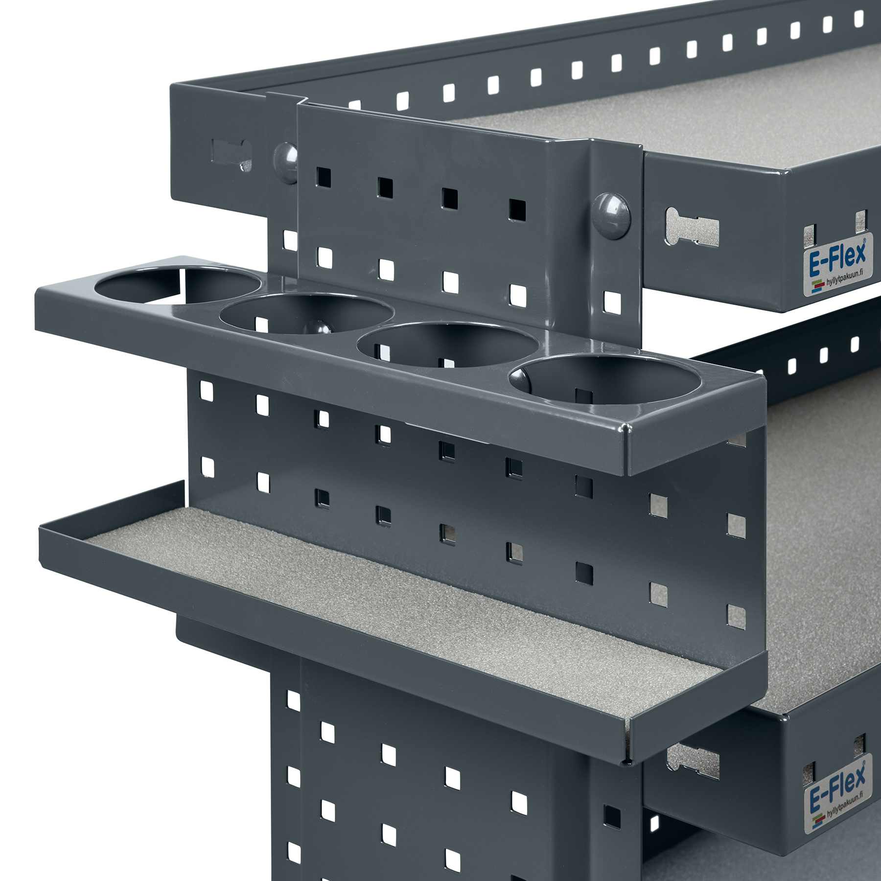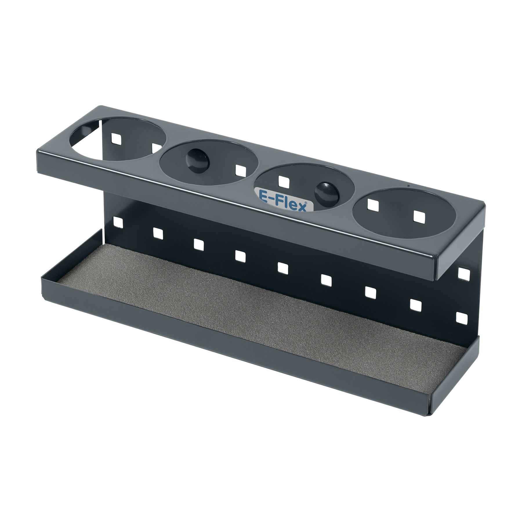 Spraypullotelineessä paikat 4:lle spraypullolle, liimatuubille tms. Sopii kiinnitettäväksi esim. hyllyn päätyyn, pakettiauton seinään tai GWS-reikälevyyn. Toimii myös hyvänä säilytyspaikkana varastoissa.